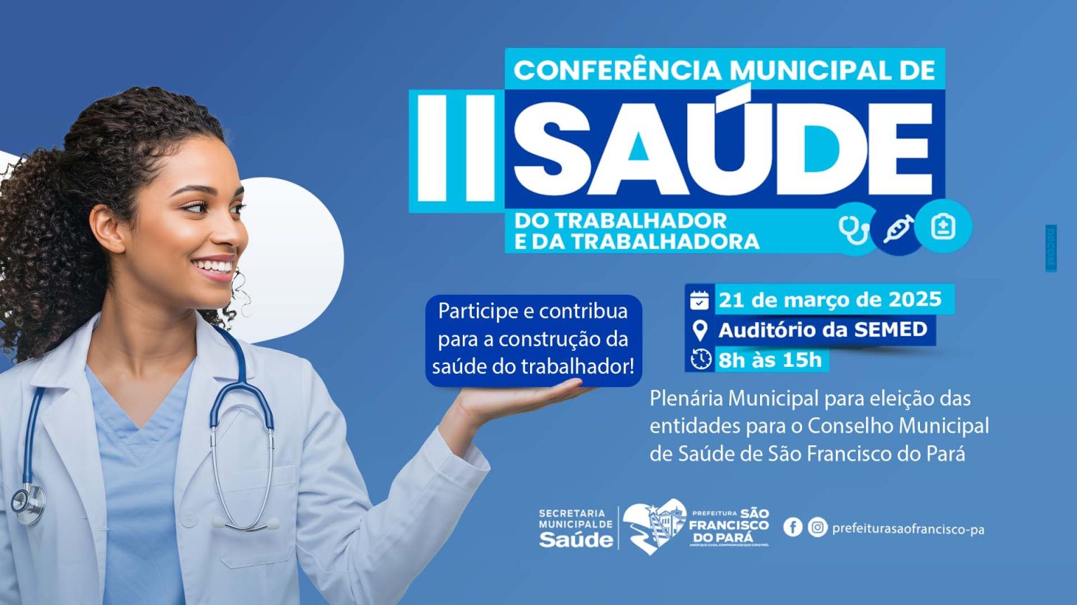 A Prefeitura de São Francisco do Pará, por meio da Secretaria Municipal de Saúde , convida a população para participar da II Conferência Municipal de Saúde do Trabalhador e da Trabalhadora.O evento acontecerá no dia 21 de março de 2025, das 8h às 15h, no auditório da SEMED, com a realização da plenária municipal para eleição das entidades que comporão o Conselho Municipal de Saúde.