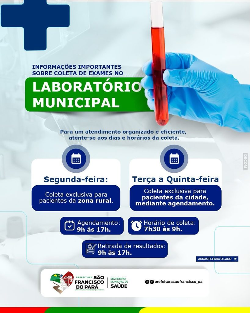 O Laboratório Municipal está com um atendimento organizado para melhor atender você! 🏥💉 ✔️ Segunda-feira: Coleta exclusiva para pacientes da zona rural. ✔️ Terça a quinta-feira: Coleta para pacientes da cidade, com agendamento. 🕗 Horário de coleta: 7h30 às 9h 📅 Agendamento e retirada de resultados: 9h às 17h Além disso, oferecemos uma variedade de exames essenciais para sua saúde, como hemograma, glicose, colesterol, triglicerídeos, beta HCG, exames para ISTs e muito mais! ✅ Para mais informações, procure a Secretaria de Saúde! Cuidar da sua saúde é nosso compromisso! 💚